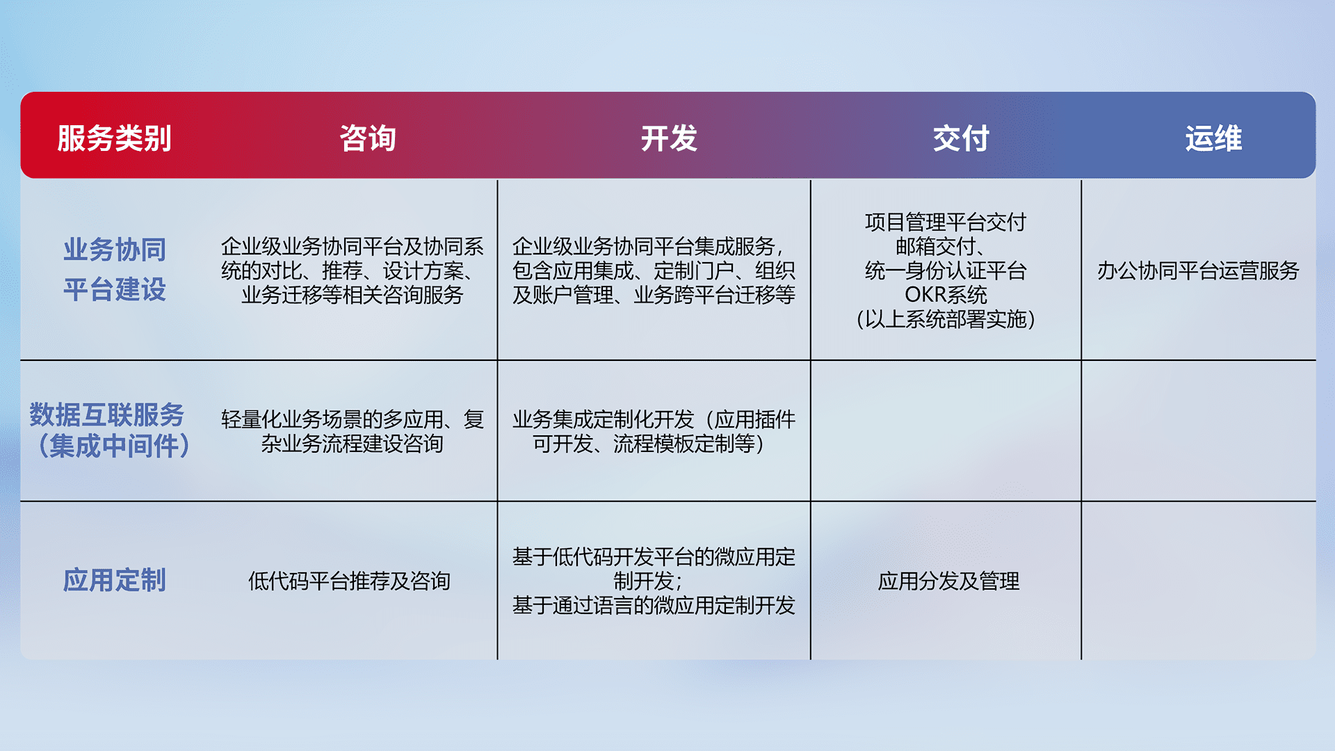 针对钉钉、、、企微、、、、IDaas等平台级产品提供产品的规划、、、方案、、、交付、、、、定制化开发等服务,,,实现如统一协同办公、、智能客户服务、、、、混合会议管理、、、、智能数据查询、、等业务场景,,,,实现数字化转型。。。。