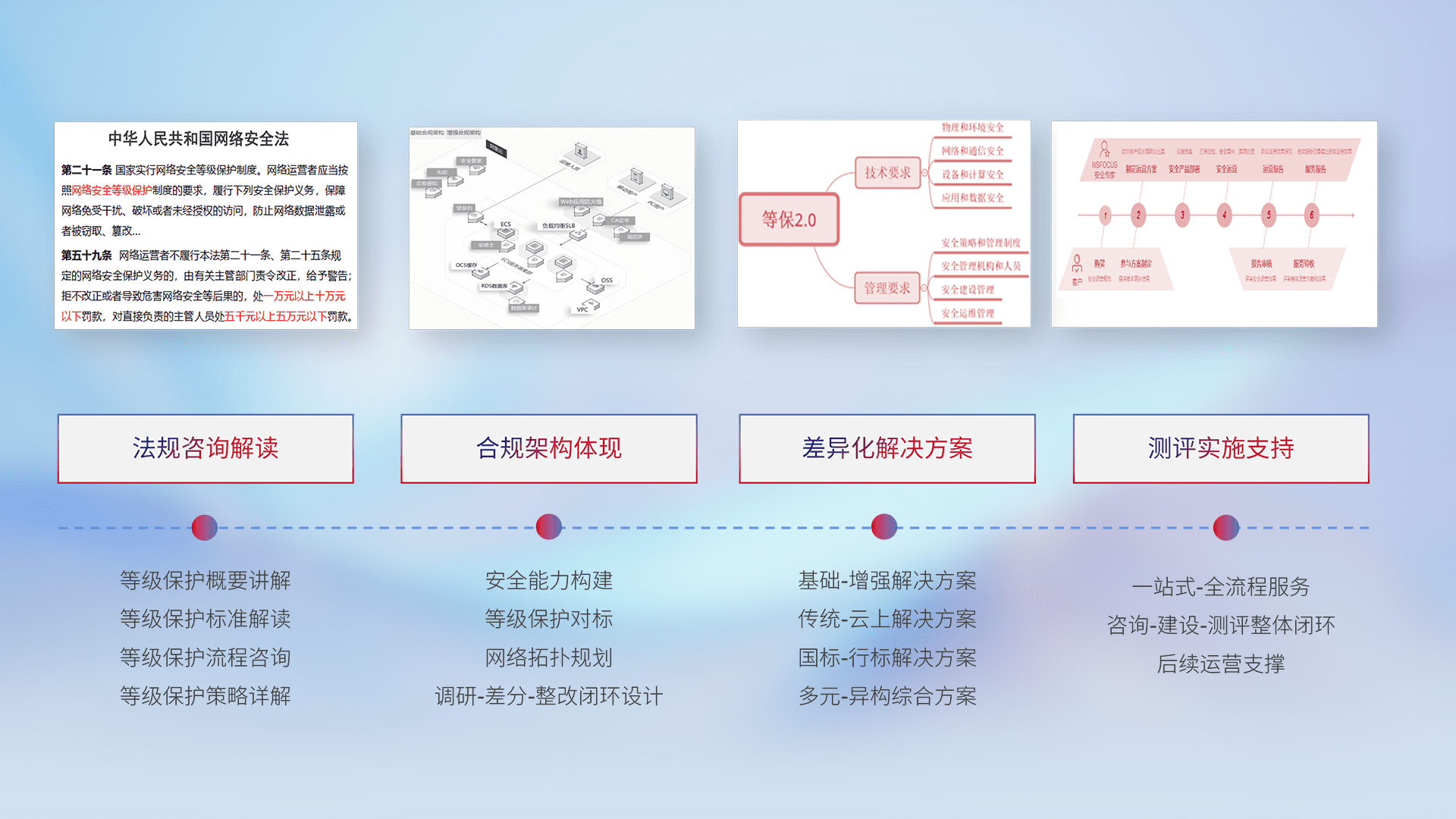 通过专业的法律咨询解读、、、合规架构体现、、、差异化解决方案、、测试实施支持等服务,,,,为客户量身打造等保合规体系。。。。